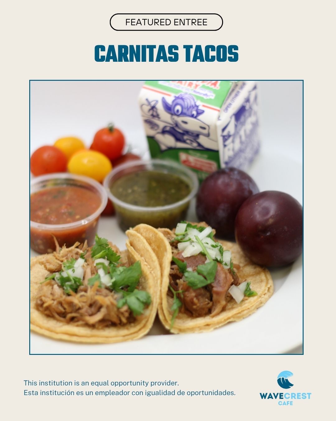 Platillos destacados para el almuerzo: Estamos agregando varias opciones nuevas a nuestra ya variada selección de platillos favoritos. Este otoño se volverán a ofrecer los famosos tacos de carnitas, el tazón de pollo a la naranja con arroz y la pizza WaveCrest recién horneada con salchichas, tocino y jalapeño, junto con las clásicas pizzas de queso y pepperoni.
