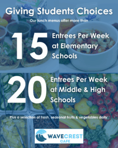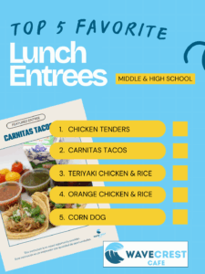 For lunch, our elementary students’ favorite items were: Chicken Tenders; Corn Dog; WaveCrest Pepperoni Pizza; Carnitas Tacos; Orange Chicken & Rice