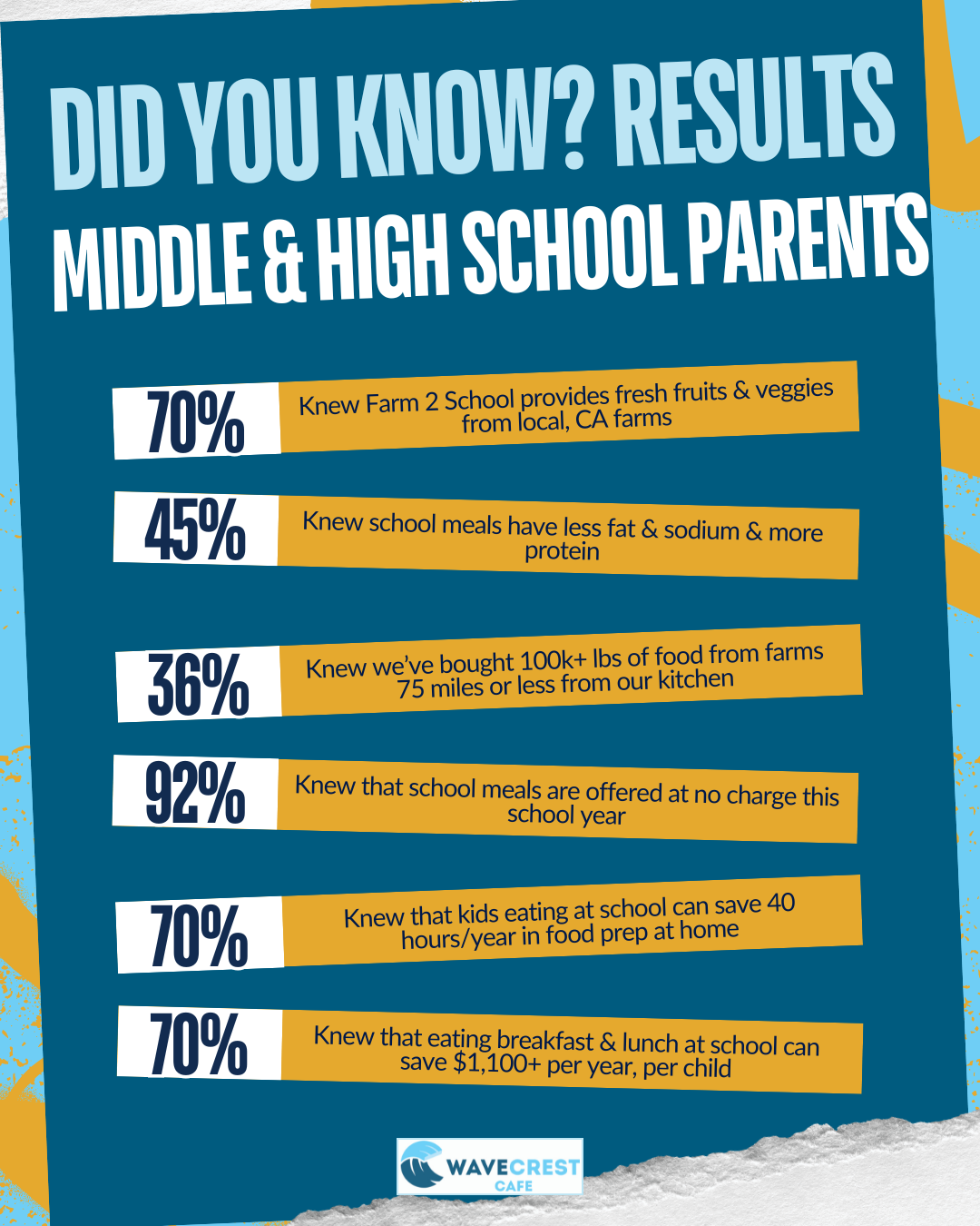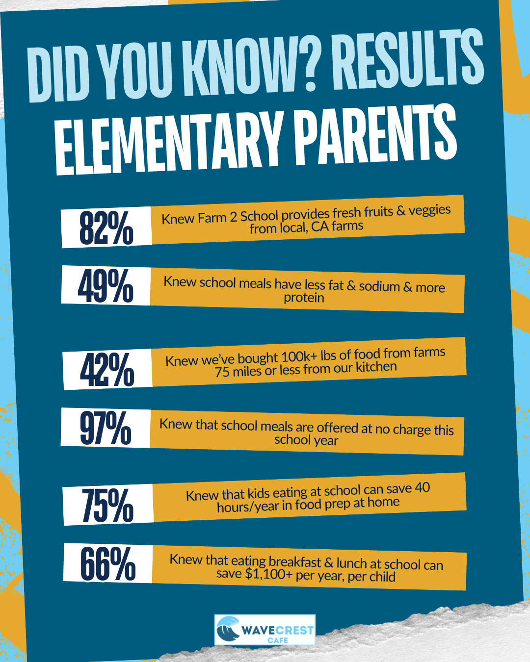 • 82% of responding parents knew our Farm to School program provides fresh, seasonal fruits & vegetables from Local California farms.