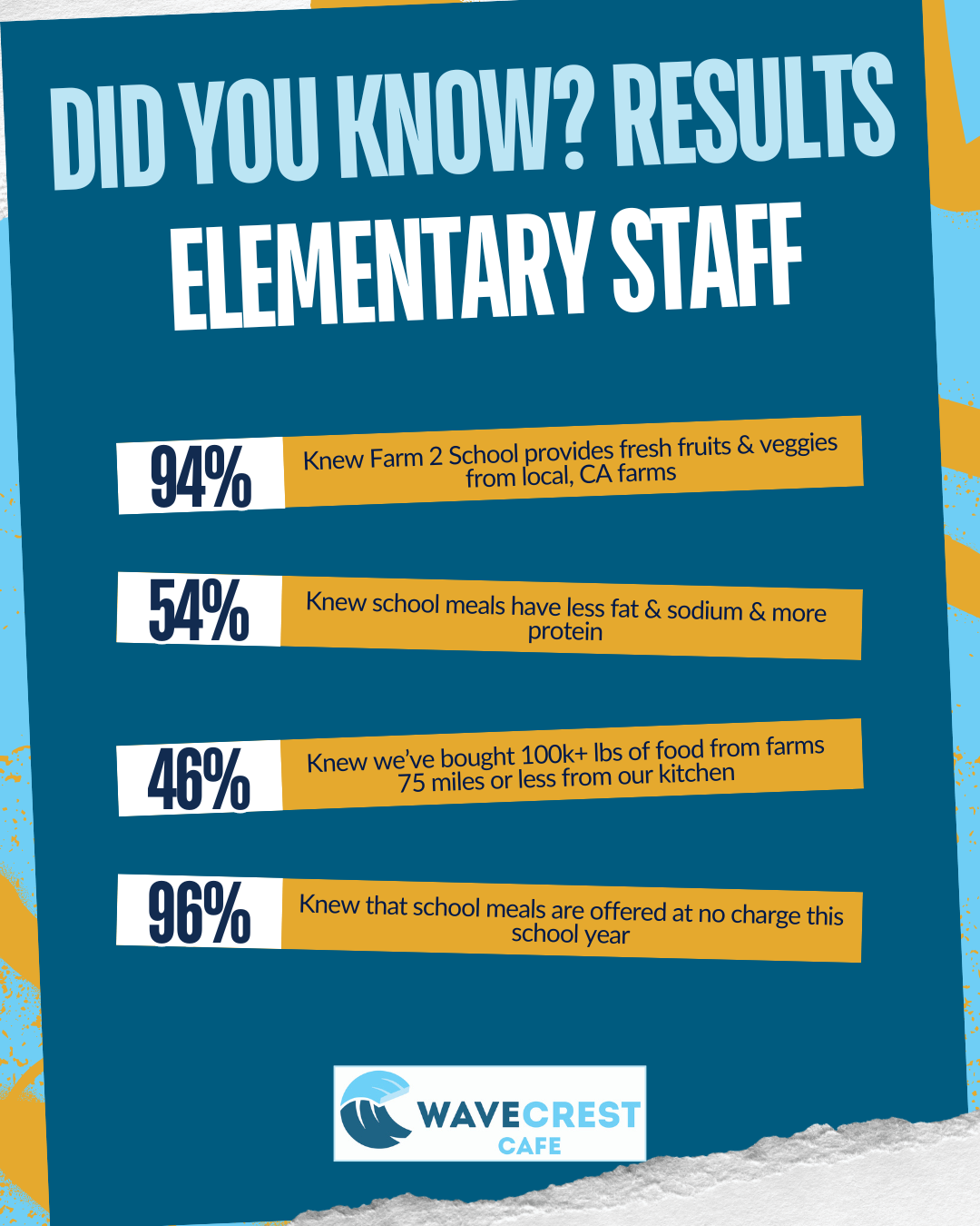 • 94% of responding staff knew our Farm to School program provides fresh, seasonal fruits & vegetables from Local California farms.