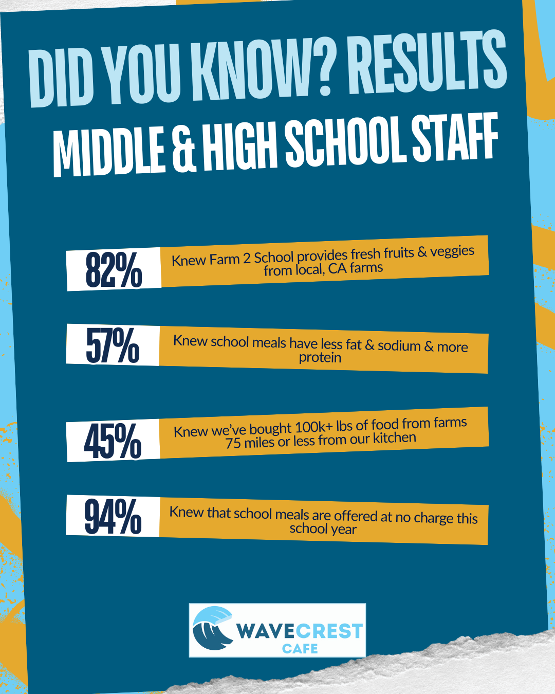• 82% of responding staff knew our Farm to School program provides fresh, seasonal fruits & vegetables from Local California farms.