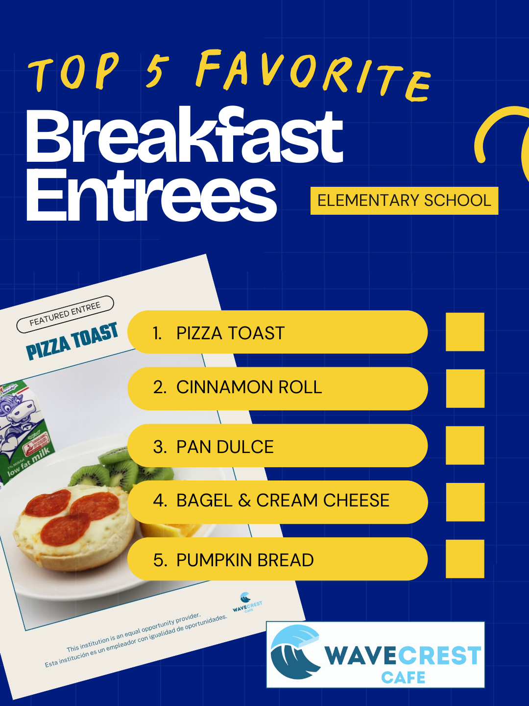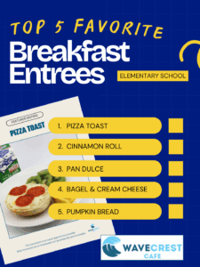The top five favorite breakfast entrees for elementary school students were: Pizza Toast; Cinnamon Roll; Pan Dulce; Bagel & Cream Cheese; Pumpkin Bread