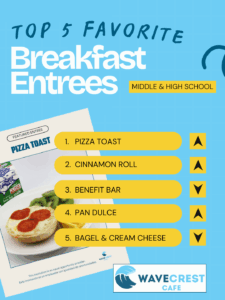 The top five favorite breakfast entrees for our middle and high school students were: Pizza Toast; Cinnamon Roll; Benefit Bar; Pan Dulce; Bagel and Cream Cheese