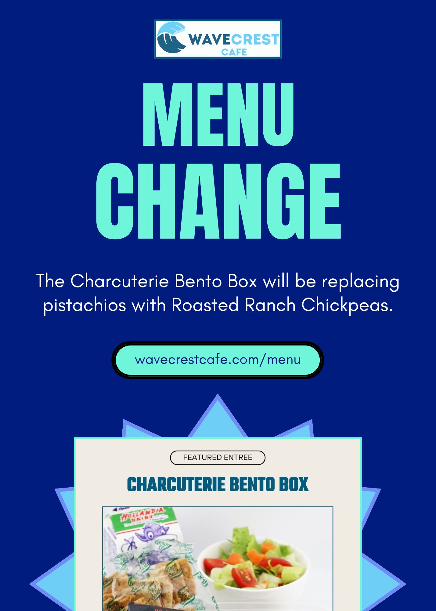 MENU CHANGE: The Charcuterie Bento Box will be replacing pistachios with Roasted Ranch Chickpeas. The box will now contain: