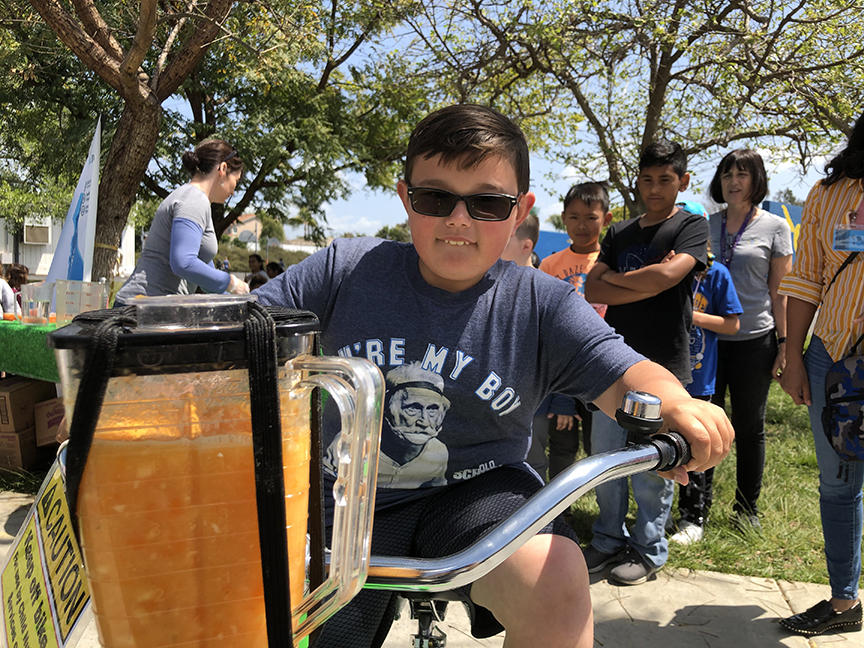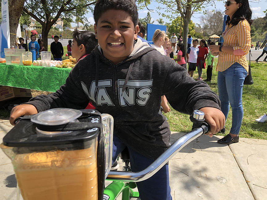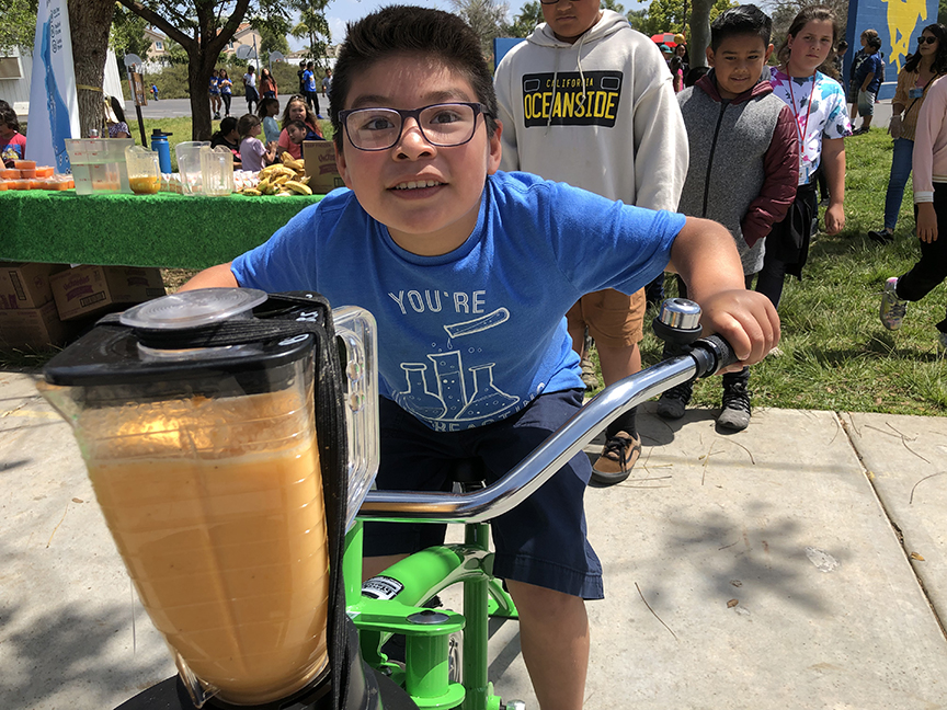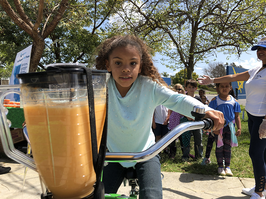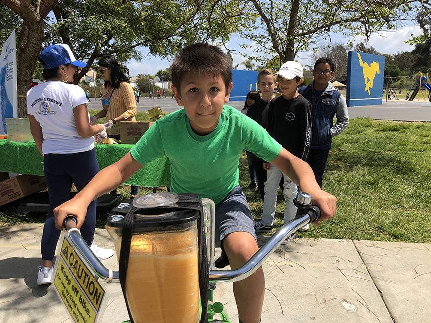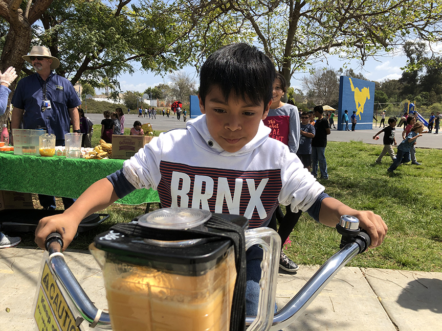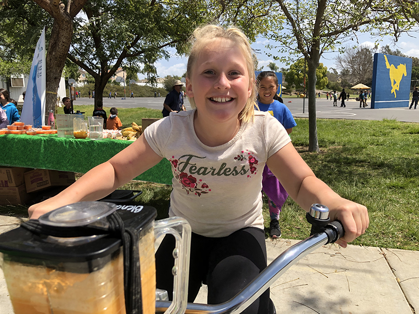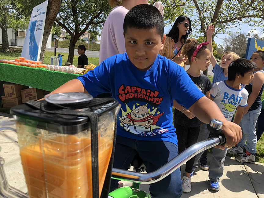 The line was non-stop and the energy palpable across the cafeteria and playground as Mission Meadows Elementary students welcomed the WaveCrest Cafe blender bikes to their school. The buzz started during recess as the bikes were being set up and ingredients assembled. Once lunch time started students flocked to the bikes to get a taste of fresh fruit smoothies and a chance to power the bikes themselves.