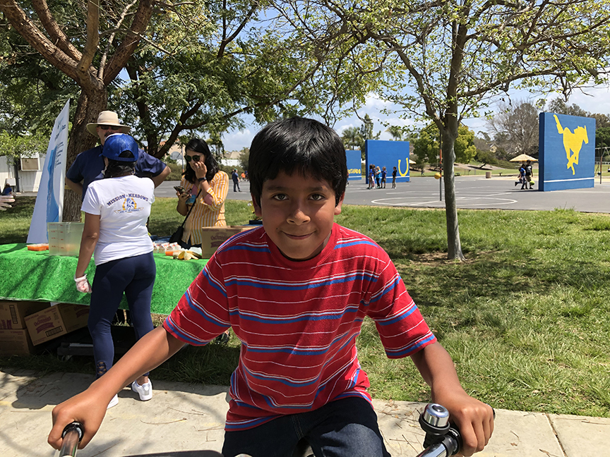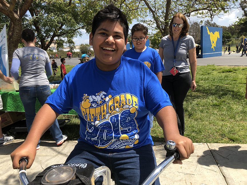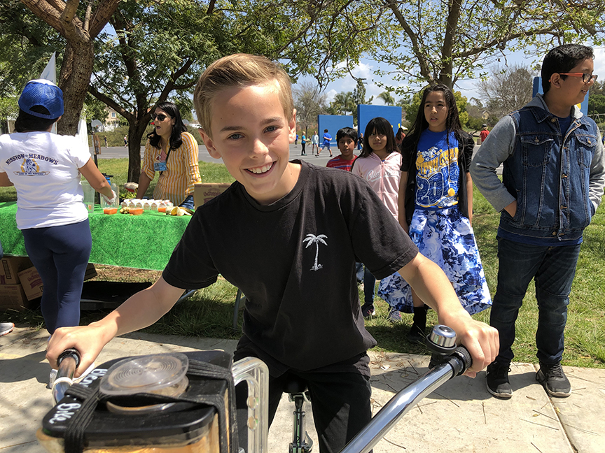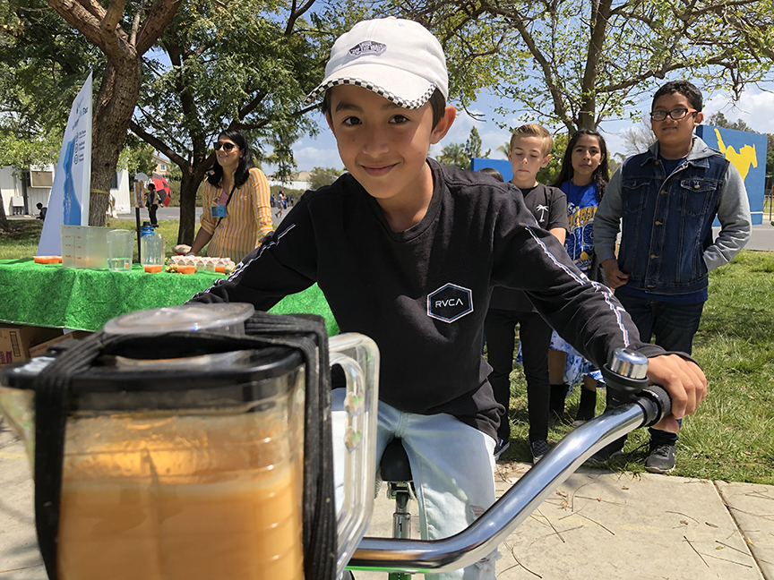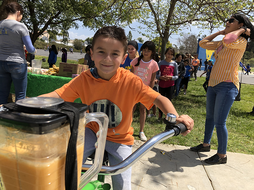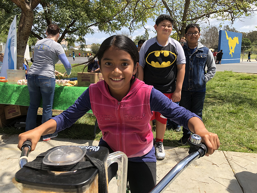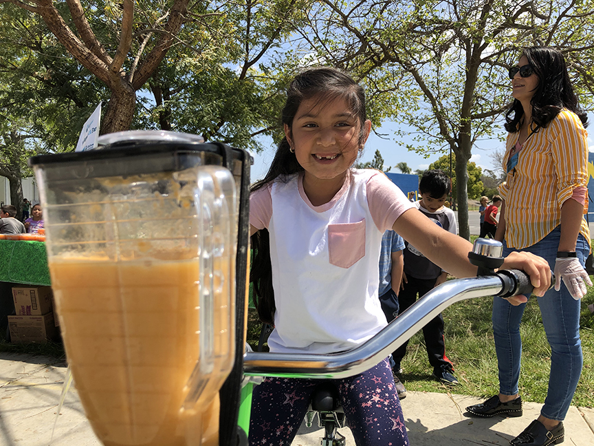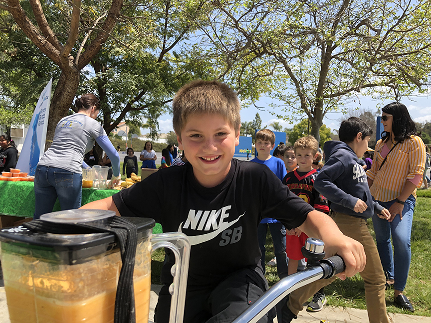 The line was non-stop and the energy palpable across the cafeteria and playground as Mission Meadows Elementary students welcomed the WaveCrest Cafe blender bikes to their school. The buzz started during recess as the bikes were being set up and ingredients assembled. Once lunch time started students flocked to the bikes to get a taste of fresh fruit smoothies and a chance to power the bikes themselves.