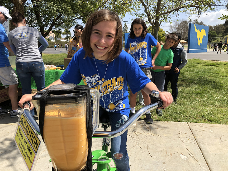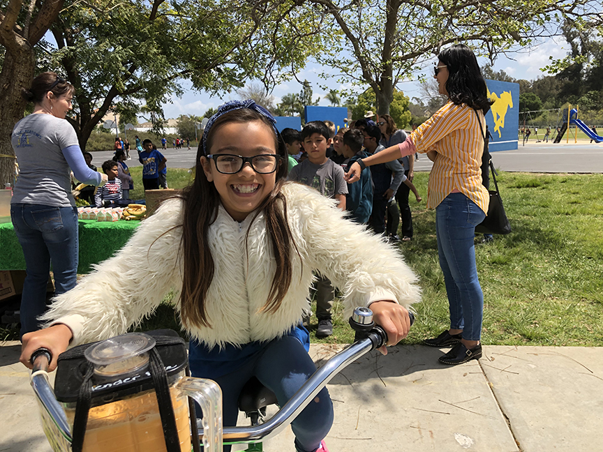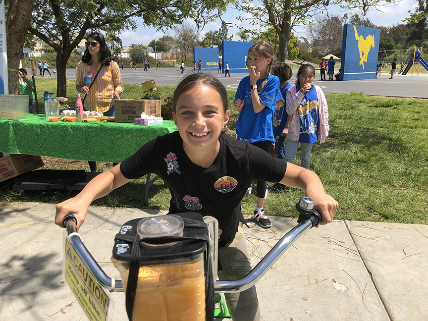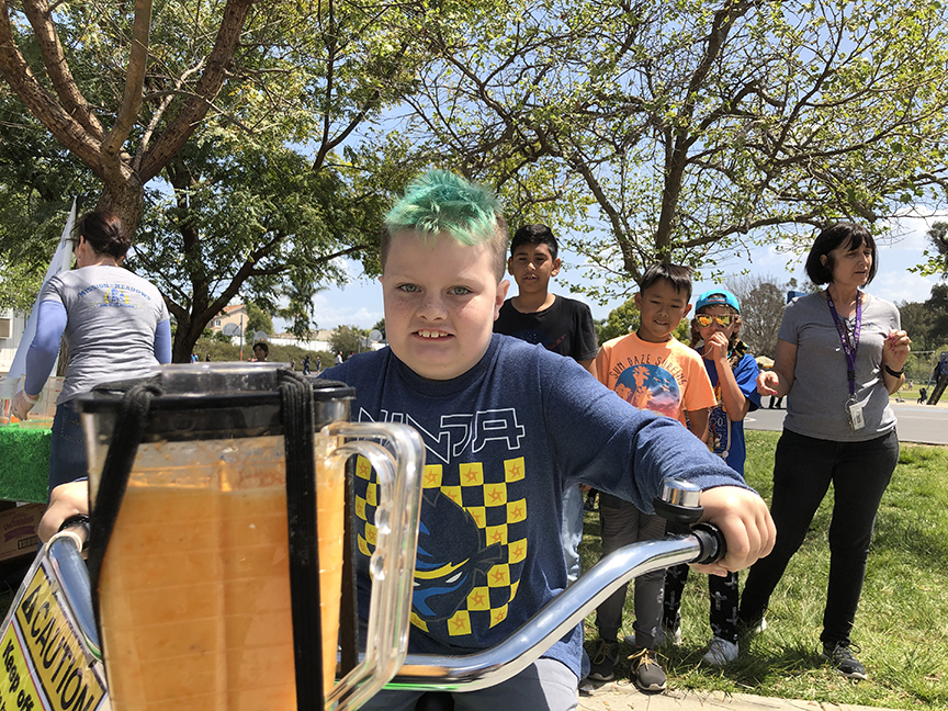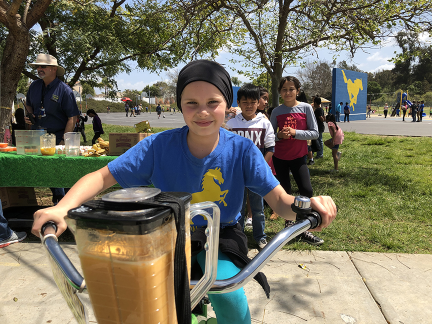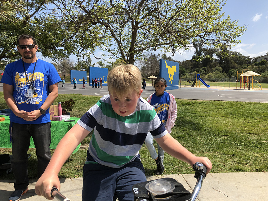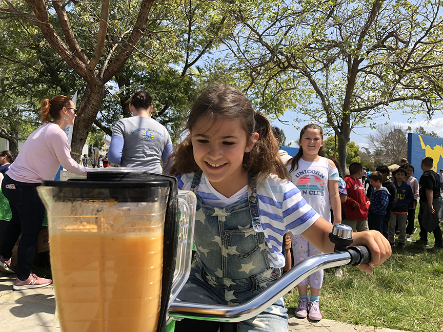 As always, the bikes served as a means of talking about the fresh, seasonal fruits and vegetables available daily at the school, including a bountiful salad bar that offers side items and toppings for meals. Principal Dr. Bill Porter kicked off the festivities with the first ride of the day, and PTA members volunteered for the event, making things run smoothly.
