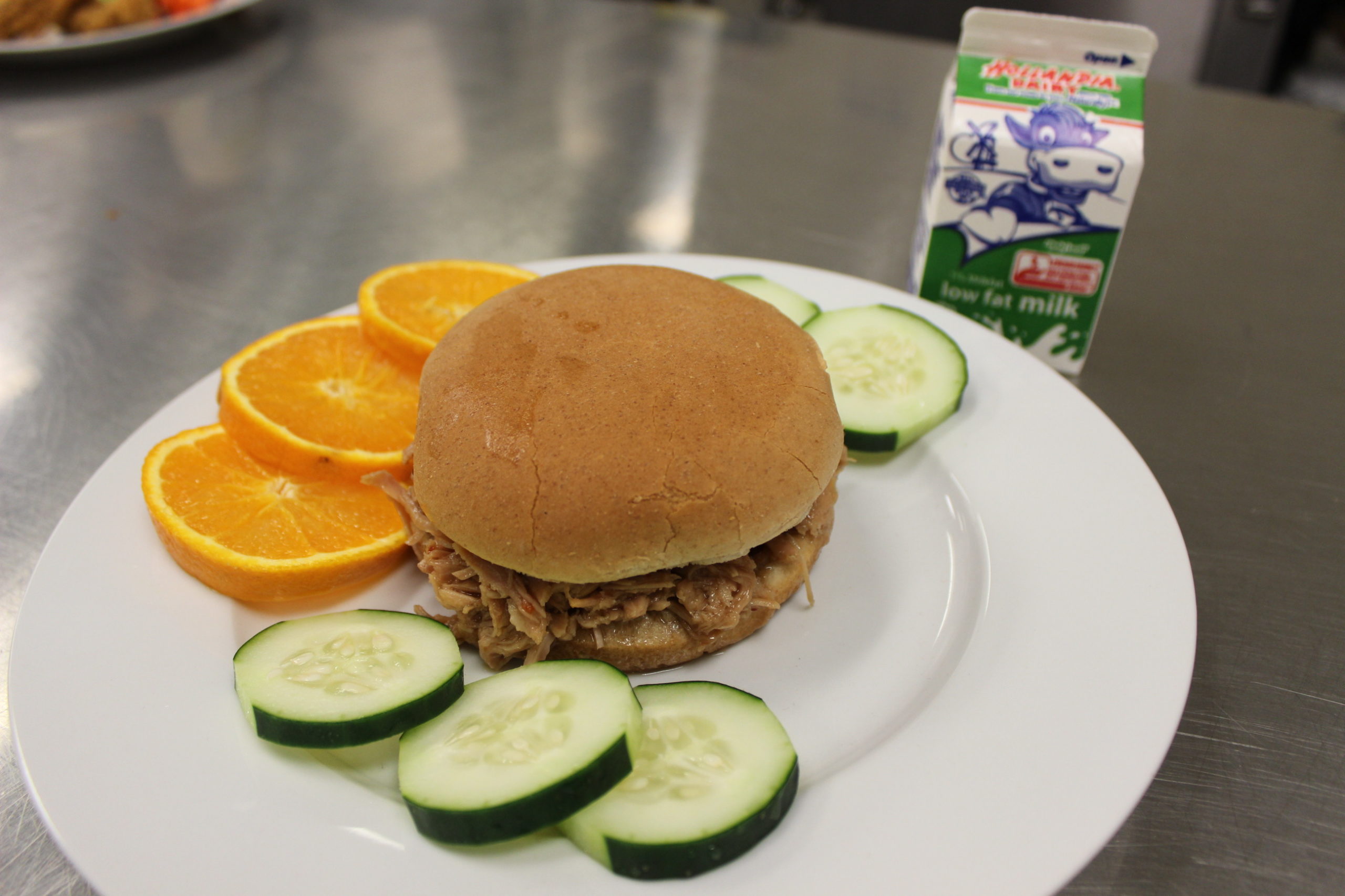 Korean Pork BBQ Sandwich: A new take on a perennial favorite. This tender and tasty pulled pork is seasoned with Korean BBQ flavors atop a soft and hearty full wheat bun. Served with fresh, seasonal fruits & vegetables.